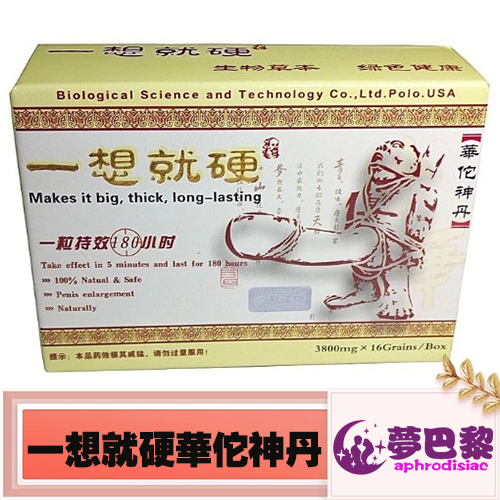 一想就硬華佗神丹由美國保羅生物科技有限公司采用藥食同源的鹿鞭、牛鞭、海狗鞭、秘魯瑪卡、壯陽果、人蔘等多種天然名貴中草藥材煉制而成。一想就硬華佗神丹對腎衰倦怠、頭暈心悸、煙花耳聾、陽W少精、時間短、勃起無力、前列腺炎和各種原因引起的性神經系統功能紊亂的男性人群具有良好的康複保健作用。使人體吸收快,能迅速恢復體力。能促進快速增長、增粗、增大、能有效解決短暫,防止、延長時間。而且能在人體內留存180小時,不會產生任何副作用及依賴性。沒有臉紅、心跳加速、惡心頭痛等反應,而且不受心臟病、高血壓、糖尿病的影響,對前列腺患者有良好的療效,酒後服用不影響效果秘方源自千年醫學珍藏,經科學配比,運用現代生物技術精制而成,具有護正固本、生精填髓、增強性能力的神奇功效。一想就硬華佗神丹直接進入到體內作用到受損處,其強大的藥氣可通過氣血直透病竈的不通之處,故此對男性問題效果顯著!